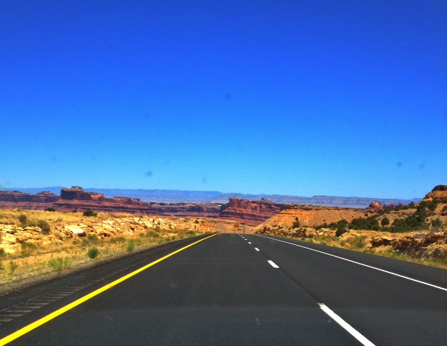 We drive for 10 – plus hours. My eyes having a hard time to stay open as we go from high desert to the Mars-like landscape of barren red rock jutting out at different levels with the Rockies (or what I kept saying were the Rockies) in the distance.