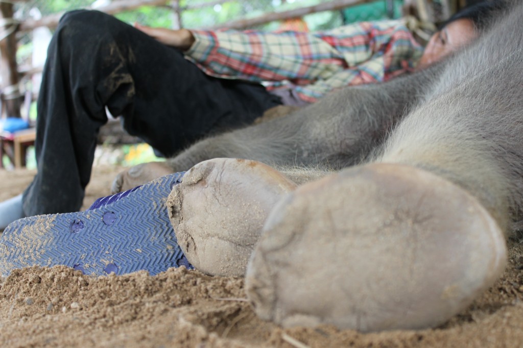 “He won’t eat and he has diarrhea,” she says softly from the wooden bench overlooking the vast land where the rest of her elephants roam freely. Lek just looks exhausted. She breathes heavy and sighs. “I am so worried he won’t make it.”