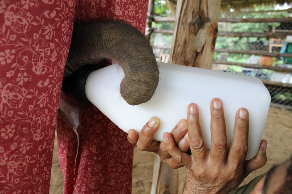 The baby elephant, Rajah Gajah, tries a bottle from Lek.