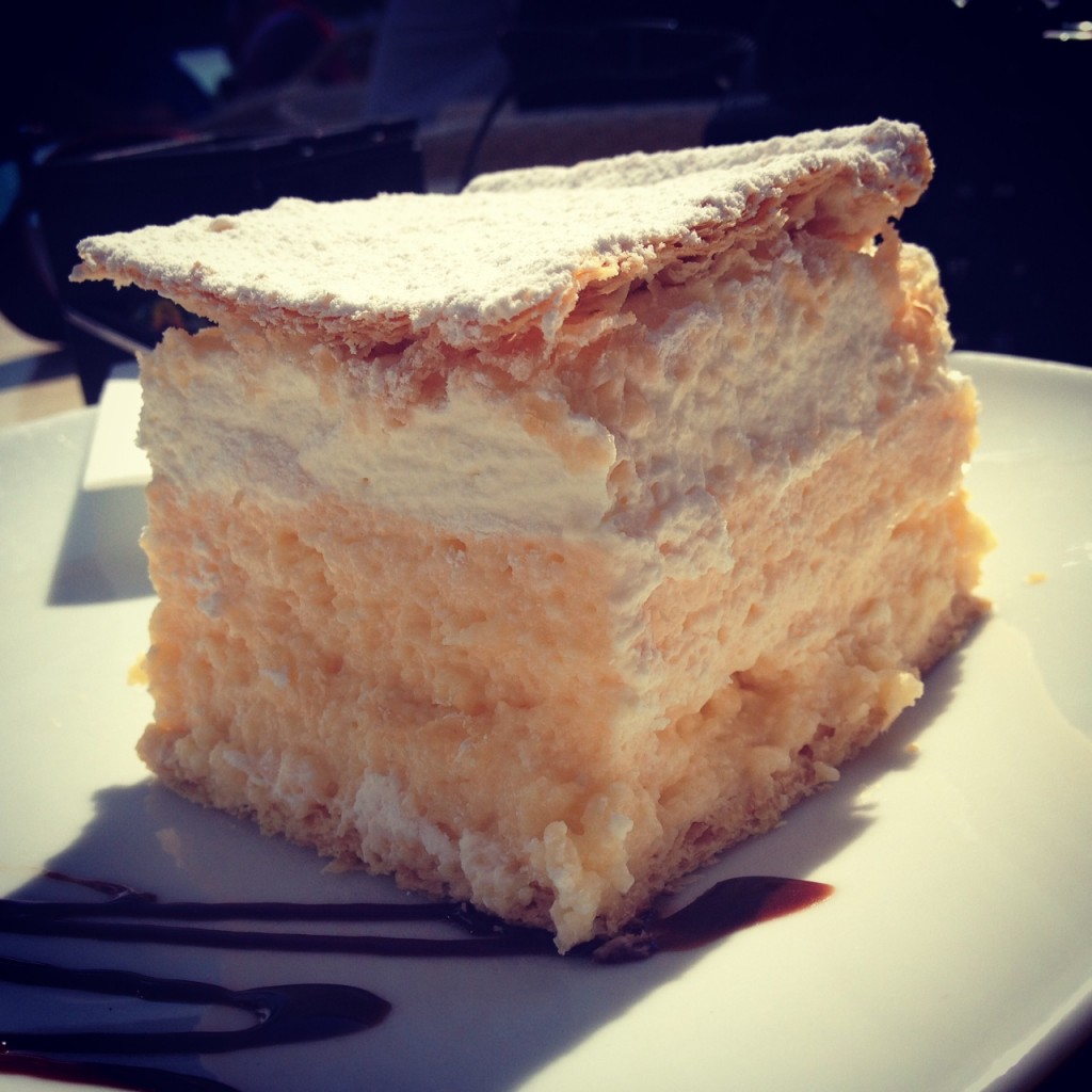 To marvel at how the pletna seem to elevate above the water. So, instead of participating in the carnival-like atmosphere, I opt to sit at a cafe and grab one of the town’s famous Bled Cream Cakes at Vila Preseren (which, according to my guide, is the place to experience the cake), a divine creation which involves a flaky buttery crust, a hunk of vanilla cream and topped with whipped cream and sugar.
