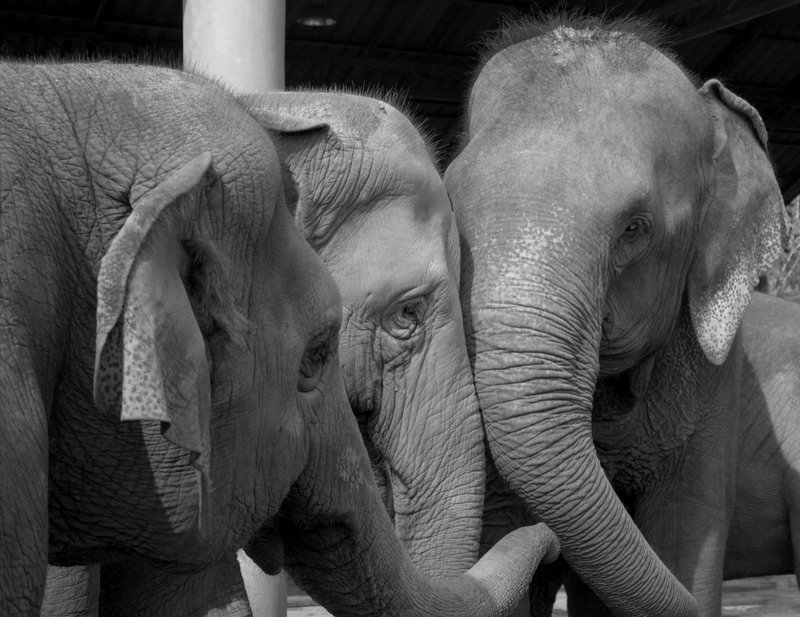 This is my all-time favorite photo. I love it because it shows a family unit that wasn’t a family until the birth of Yin Dee. The son of Mintra, this little guy is special, mostly because experts at the park didn’t think Mintra would ever be able to give birth to a calf, thanks to her injuries from her previous life. Once he was born, Malai Tong, a victim of a land mine, joined the little herd and is now one of his aunties.