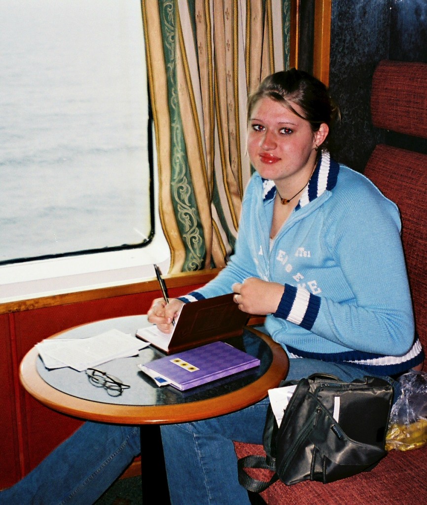 “Come, come,” Lek says to her, and then the blonde Austrian girl comes and sits with us, too.